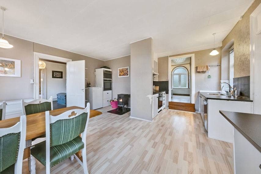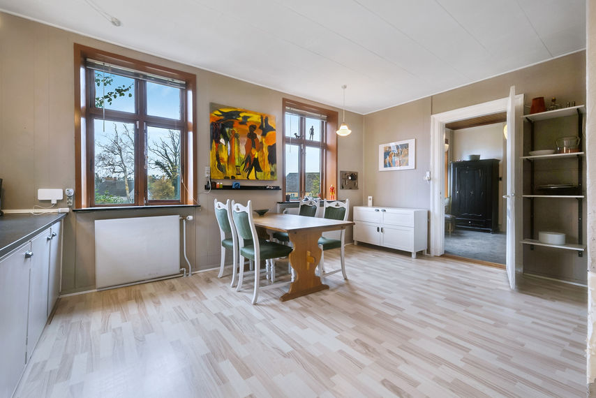 Huset byder på et lyst og rummeligt køkken perfekt til hyggelige familiestunder og madlavning med udsigt til de smukke omgivelser. Stuen er hjemmets hjerte, hvor solstrålerne filtreres gennem de store vinduer og skaber en lys og indbydende atmosfære.
